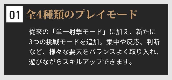 4種類のゲームモードと本物感あふれる撃ち心地で、家でも外でも、いつでも射撃の世界へ飛び込めます。