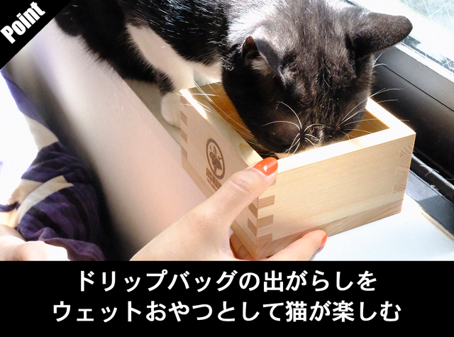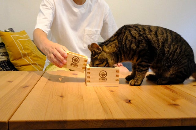 人が日常的に使いやすい一合サイズの「JISHAKUの枡 S」は「DASHI DRIP JISHAKU BLEND」のドリップバッグがぴったりのサイズ感で、ドリップした出汁をそのままヒノキの香りとともに味わうことができます。器として家庭で使用する枡のサイズとして最も使い勝手が良く、またインテリアとして部屋に飾る際にも丁度いいサイズ感です。猫の使用を想定した二合半のサイズの「JISHAKUの枡 L」は、猫の食事を邪魔しない口の広いサイズ。枡の縁にひげが干渉して食べづらい・飲みづらいということもなく、頭がすっぽりと入るサイズ感。枡で食事をする姿がとても愛らしく見えます。