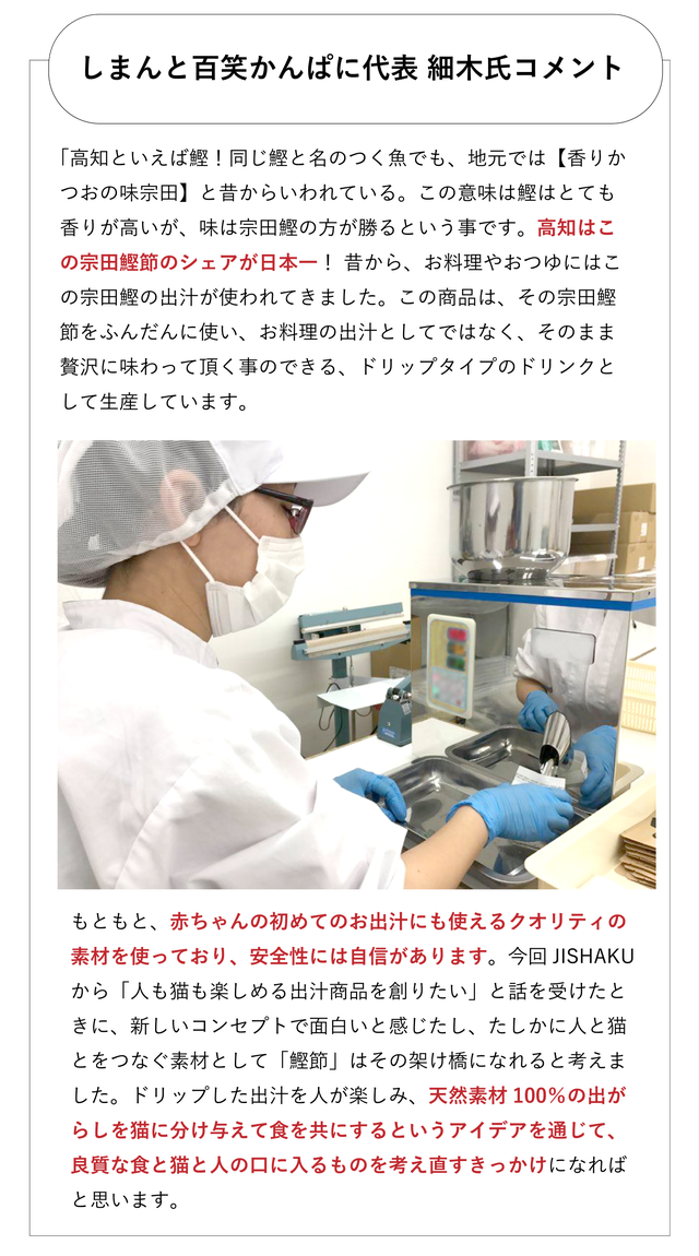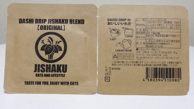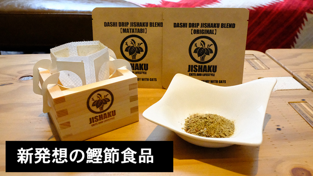高知産の鰹節を使った「DASHI DRIP JISHAKU BLEND」は人だけではなく、猫もともに楽しめる新しい食の提案です。塩・化学調味料・食品添加物不使用で、天然素材だけでつくられています。もちろん猫に害がある素材は一切使用していません。高品質な高知県産の鰹節粉末をベースとしたブレンド出汁は、人が美味しく楽しめることはもちろん、ホッと一息つきたいときの健康的な飲み物としてお召し上がりいただけます。