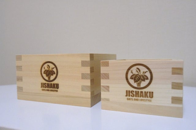 猫用の「JISHAKUの枡 L」に共に暮す猫のお名前をレーザー刻印いたします。