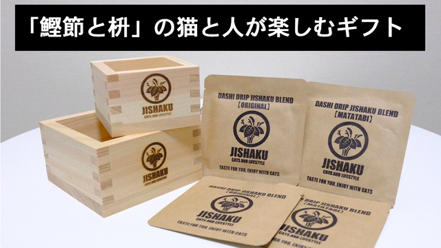 猫と人がシェアできる新発想の鰹節食品「DASHI DRIP JISHAKU BLEND」(無添加・無塩の鰹節食品)と、人と猫お揃いのアイテムとして日常使いできる「枡」をセットにした、「猫と人が一緒に食を楽しめる」ギフトセットです。