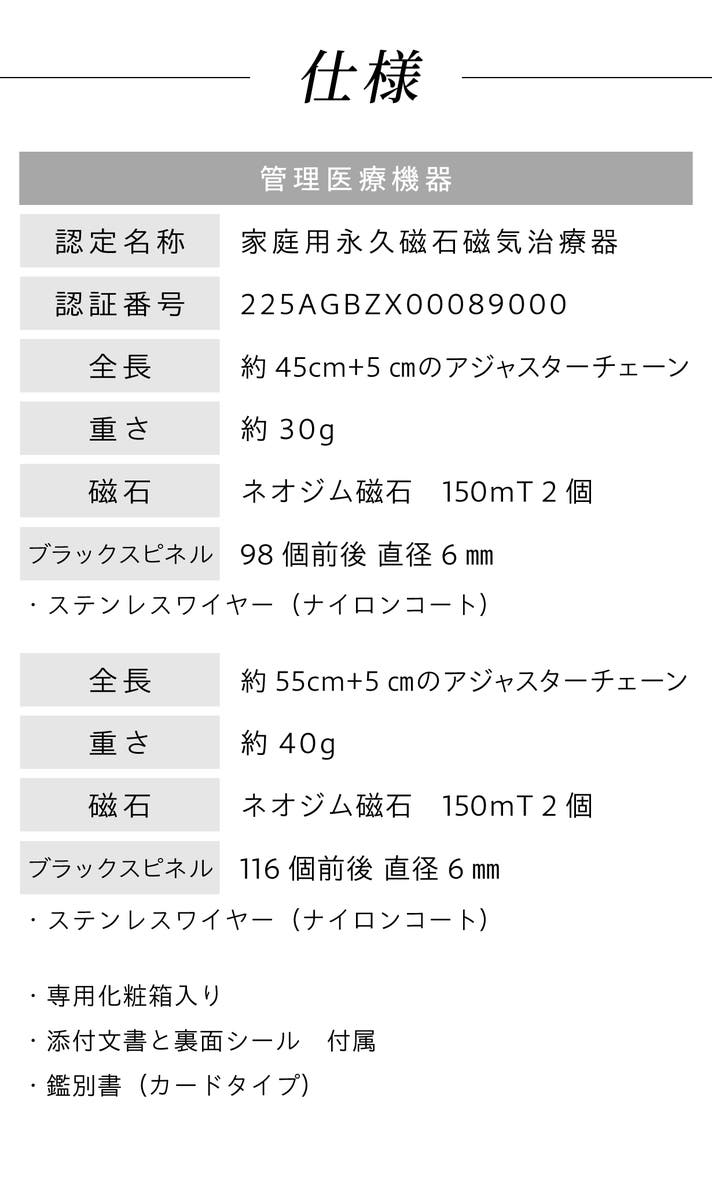 このネックレスには、厚生労働省から管理医療機器として認証を受けた磁石(ネオジム磁石×2粒)を使用しています。