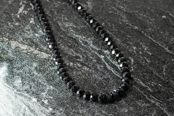 何十ものカット面が施されたビーズは、1粒1粒がミラーボールのように360度、艶やかに黒光りします。
