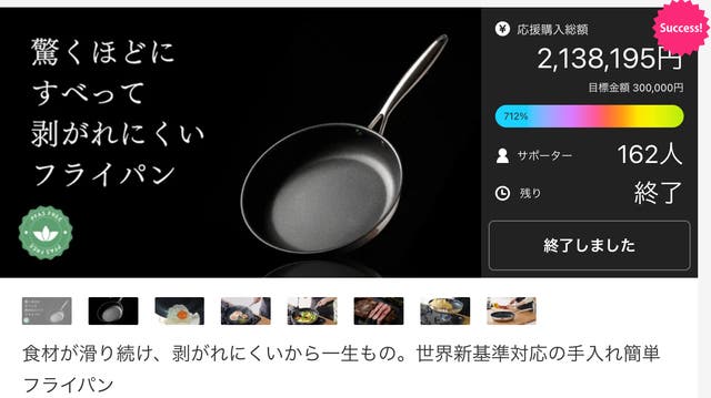 「Makuake(マクアケ)」は、実行者の想いを応援購入によって実現するアタラシイものやサービスのプラットフォームです。このページは、 プロダクトカテゴリの 「食材が滑り続け、剥がれにくい一生物。世界新基準対応のフライパンから新サイズ登場」プロジェクト詳細ページです。