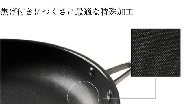 デボス加工は、フライパンの表面に微細な凹凸ができます。これにより、食材がフライパンにくっつきにくくなり、強い焦げ付きが防止効果があります。