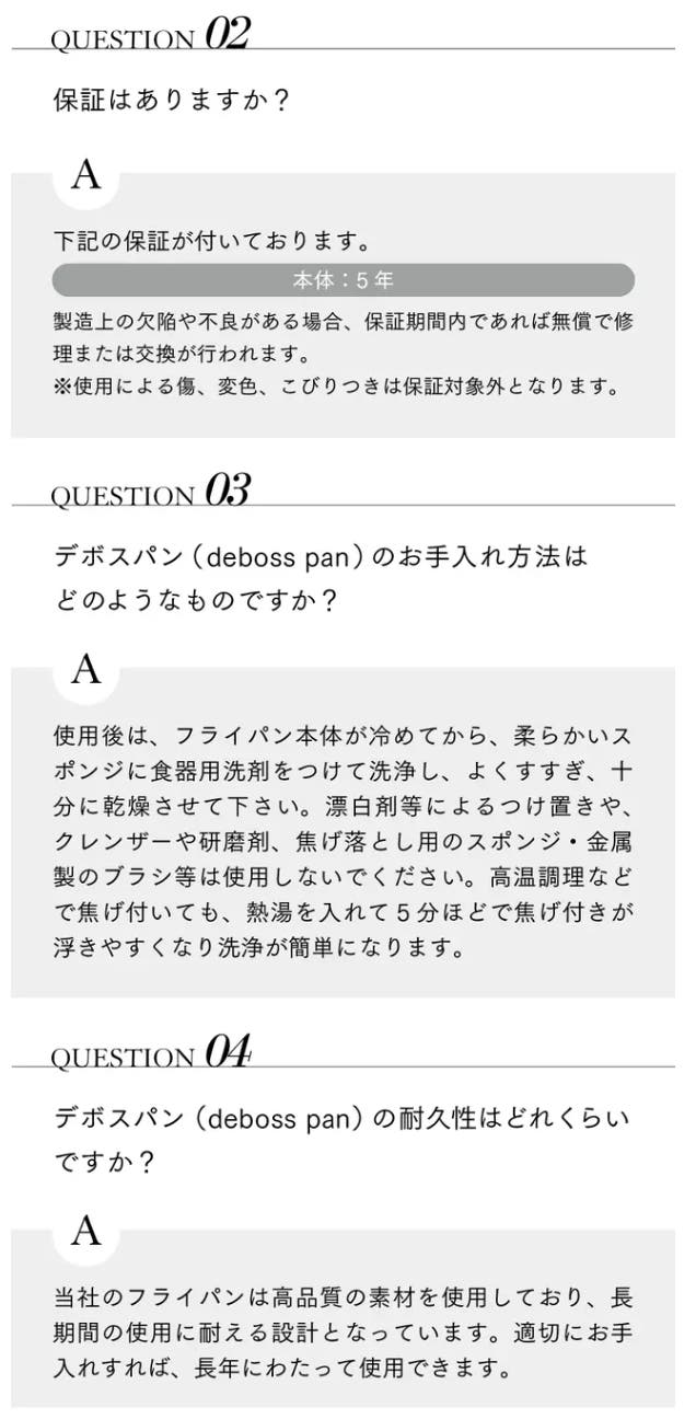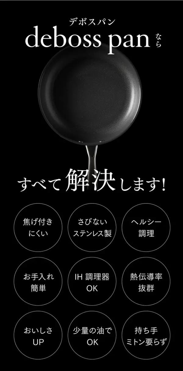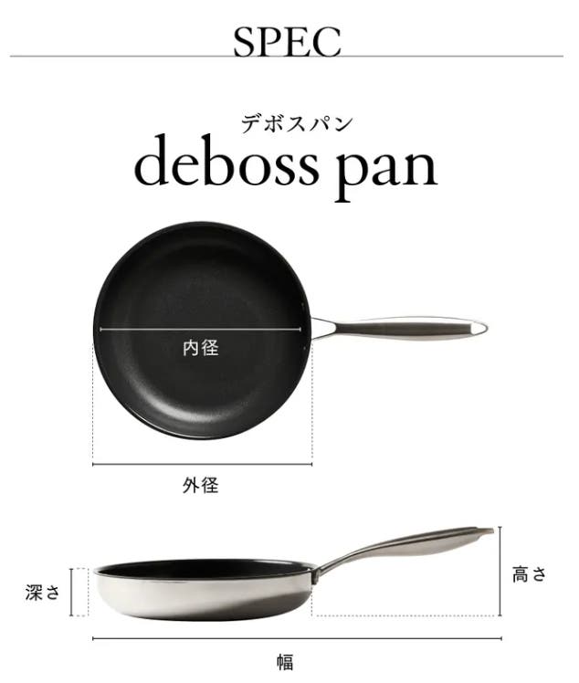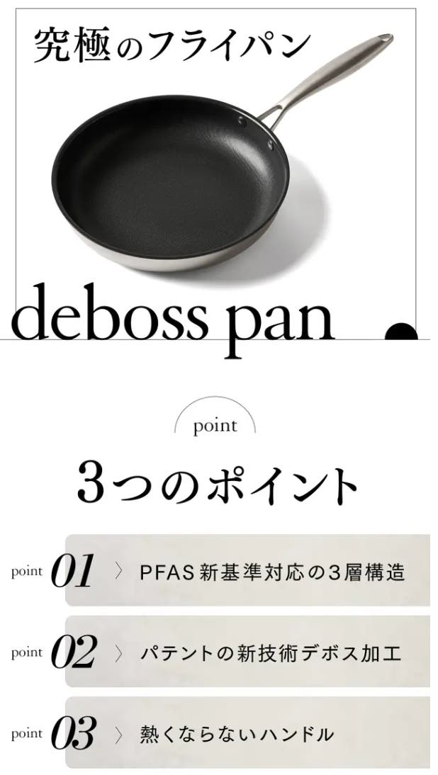 デボスパン(deboss pan)は、食材の熱通りが非常に良い特殊3層金属製で、世界的に使用規制され始めているPFASフリー対応のフライパンです。