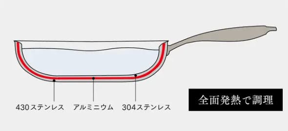 ステンレス×アルミニウム×ステンレスの全面特殊三層構造+外面は高級鏡面仕上げを実現。フライパン全体に迅速に熱を伝えることで、ステーキ調理は外側を素早く中側をジューシーに焼くことが可能に。