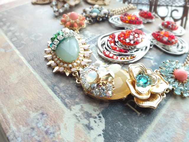 和紙の上には、ラインストーン、ヴィンテージビーズ、ガラス玉いっぱいです。