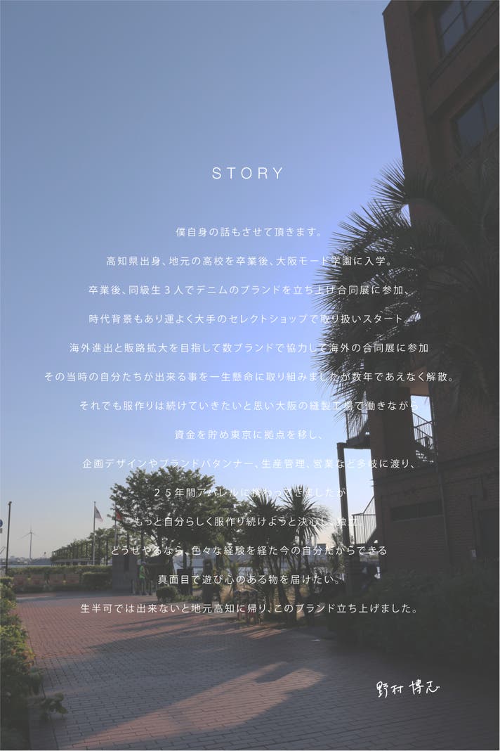 僕自身の話もさせて頂きます。高知県出身、地元の高校を卒業後、大阪モード学園に入学。卒業後、同級生3人でデニムのブランドを立ち上げ合同展に参加、時代背景もあり運よく大手のセレクトショップで取り扱いスタート。海外進出と販路拡大を目指して数ブランドで協力して海外の合同展に参加と、その当時の自分たちが出来る事を一生懸命に取り組みましたが数年であえなく解散。それでも服作りは続けていきたいと思い大阪の縫製工場で働きながら資金を貯め東京に拠点を移し、企画デザインやブランドパタンナー、生産管理、営業など多岐に渡り、25年間アパレルに携わってきましたが、もっと自分らしく服作りを続けようと決心。どうせやるなら、色々な経験を経た今の自分だからできる真面目で遊び心のある物を届けたい。生半可では出来ないと地元、高知に帰り、このブランド立ち上げました。
