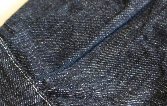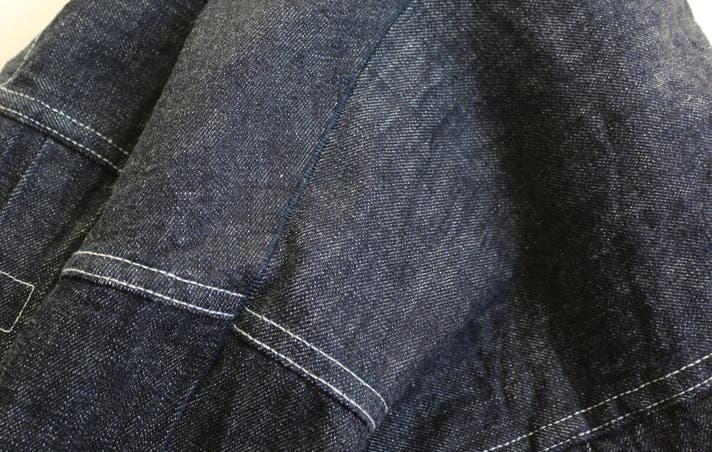 右綾デニム、インディコ染(ロープ染色)、経糸、緯糸の打ち込み本数が多い為、硬くしっかりとした生地感、経糸緯糸ともに太番手、ザラツキ感あり