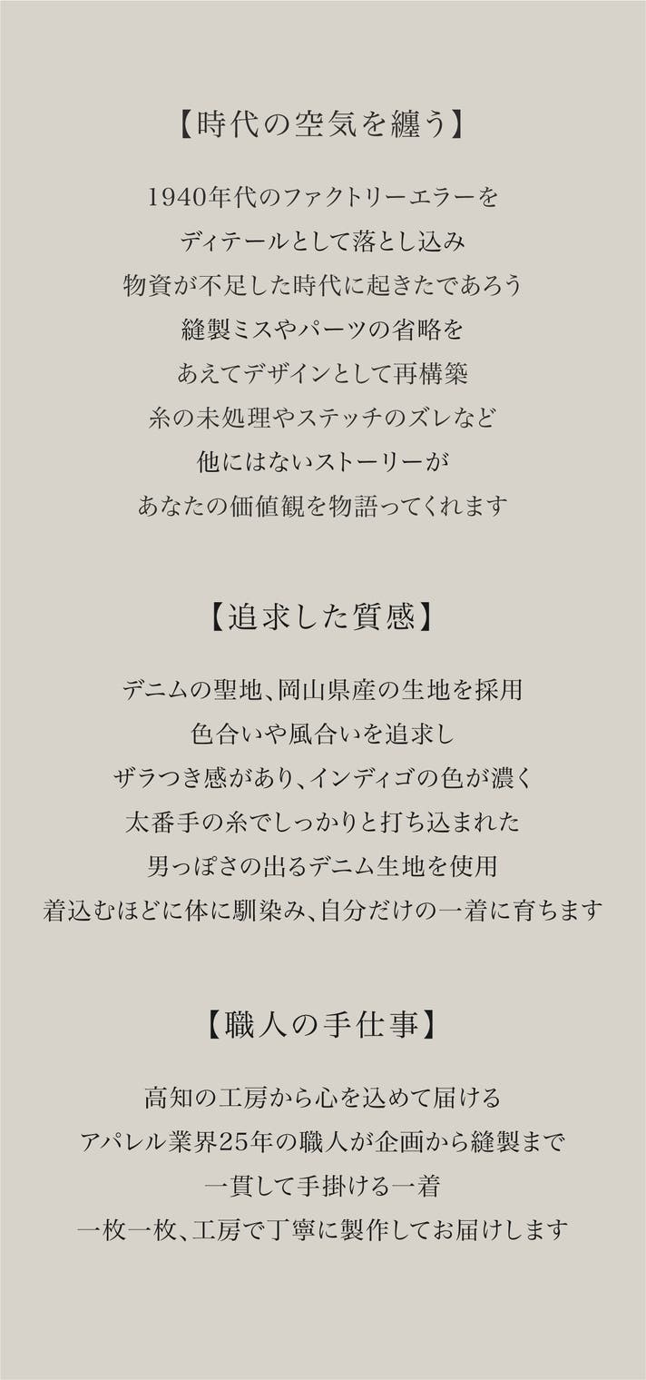 ヴィンテージの持つ魅力の中に、ファクトリーエラーという個性を持ったデニムジャケットに仕上げました。質感や色合いを追求した岡山県産デニム生地を使用し、意図的なエラーを落とし込んだこのジャケットが、着込むほどにあなたの体に馴染み、時間と共にあなただけのヴィンテージへと変わっていく過程を楽しんでもらえたら嬉しいです。(ワンウォッシュ仕様)