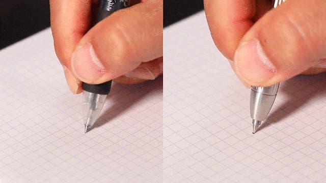 大量生産された筆記具の多くは、リフィルと本体の嵌め合いに余裕があるので、書く際にペン先が揺れてしまいます。これでは思った通りに書けずに書かれた文字がブレてしまいます。本製品の固定用アダプタでリフィルの中央から後方部をしっかりと固定し、ブレにくくする事で思った通りに書きやすくします。