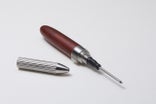 グリップ部にはローレット加工を施しました。製図用筆記具などに良く見られる滑り止め加工ですが、サイズなども細かく計算し、弱い力でもしっかりと滑らずグリップができます。