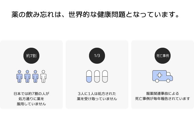 多くの人々が日々の服薬に困難を感じており、服薬忘れが健康に与える影響の深刻さを実感したことから、最新のAIおよびIoT技術を活用して、より確実に服薬管理ができる製品を構想しました。