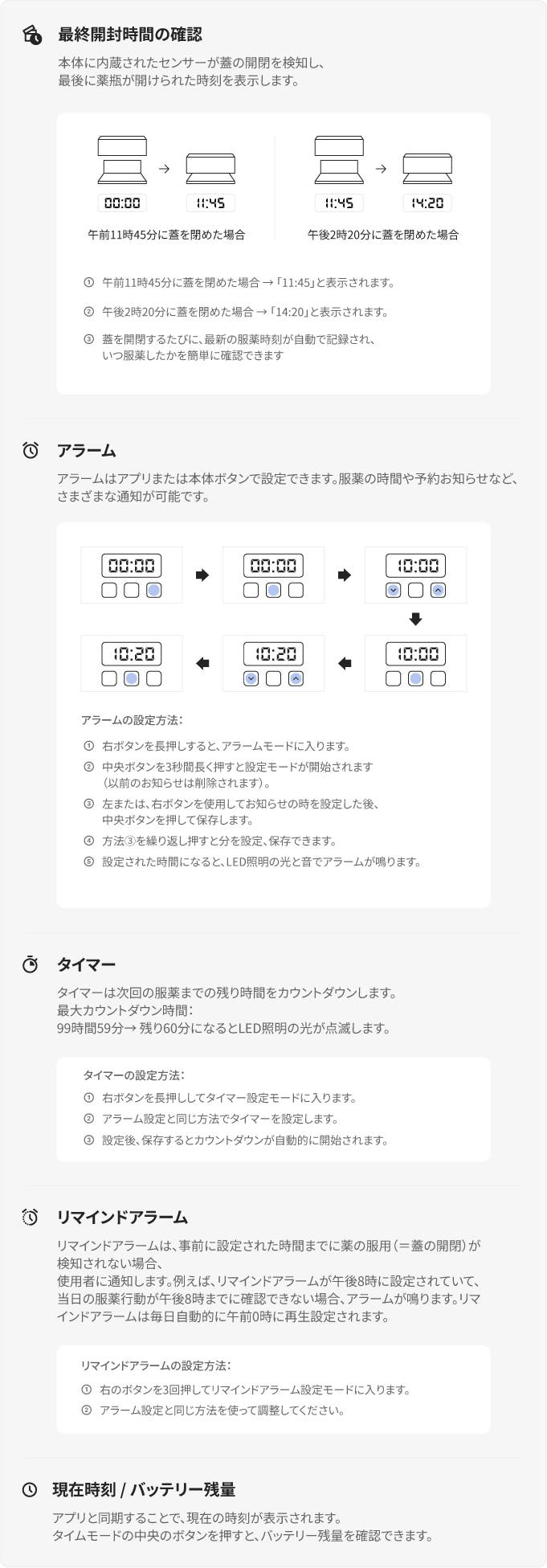 - 自動で服薬時間や履歴を記録。いつ服用したかを簡単に確認でき、健康管理に役立ちます。
