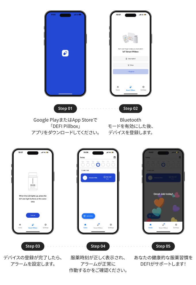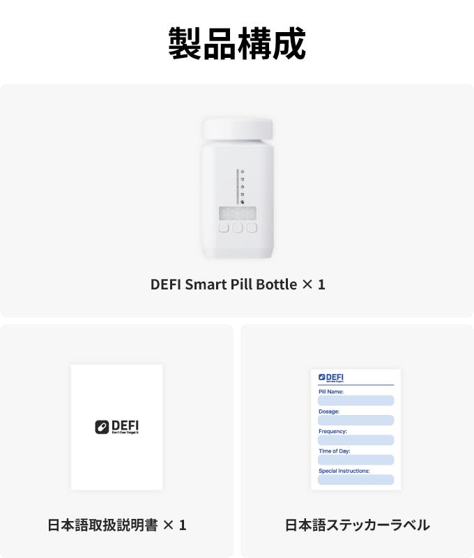 DEFIは複雑な手順なしで簡単に使い始めることができ、すべての機能は薬ボトル本体で直接操作できます。