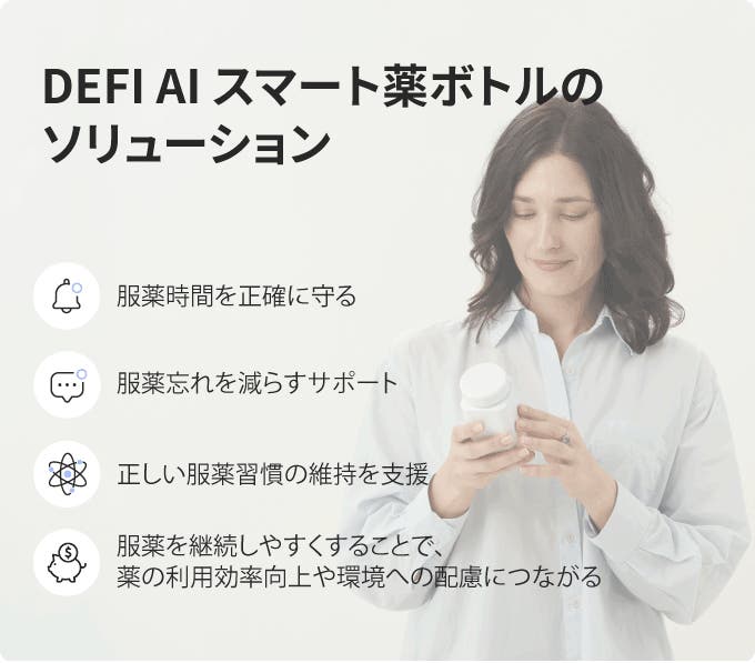 自分の健康をしっかり守るには、継続的な服薬が不可欠です。DEFI AIスマート薬ボトルは、より確実な服薬管理で健康管理をサポートします。DEFIを使えば、次のような成果が期待できます。