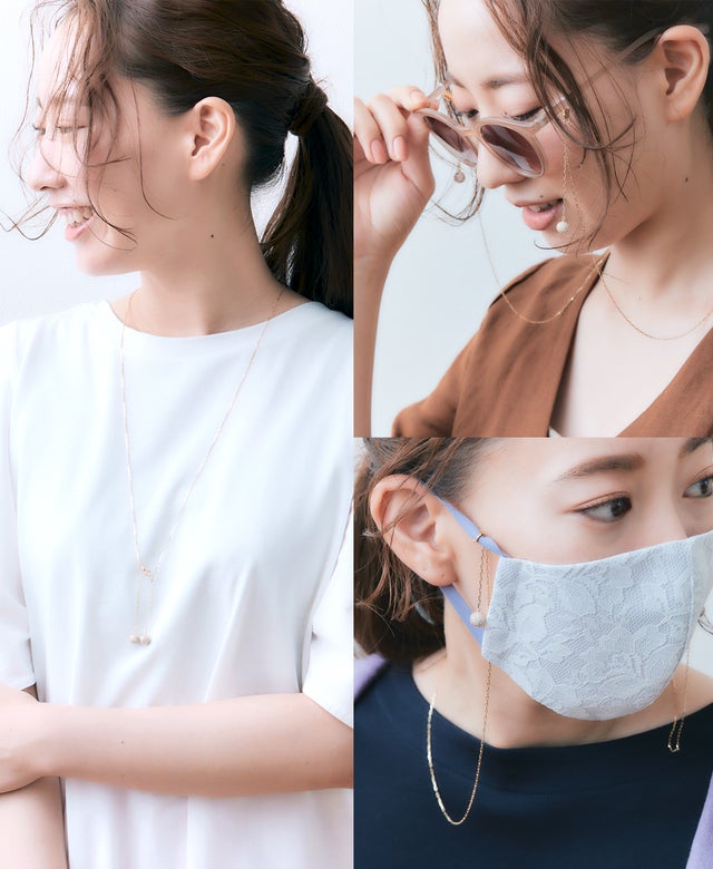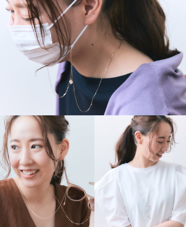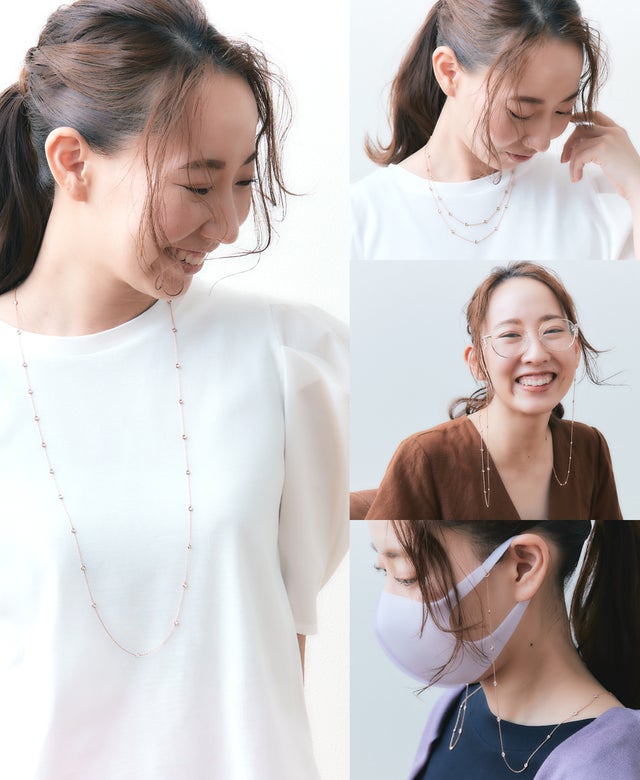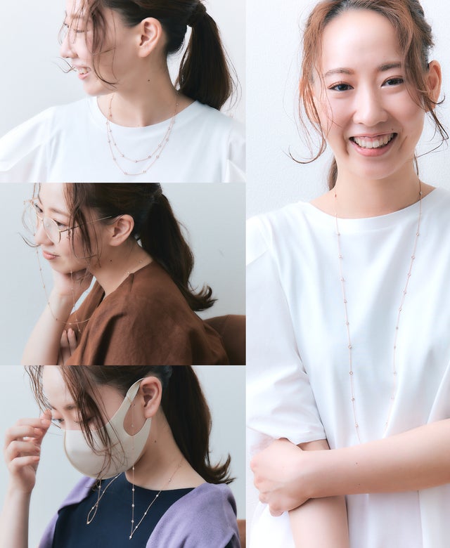 3WAYタイプのスタイルで、ネックレス~ メガネチェーン~ マスクホルダーとシーンに合わせてご自由にお使いいただけます。左右1センチずつチャーム部分の長さを変えることで、2つのチャームが胸元でゆれても傷つかないように考えられた設計です。