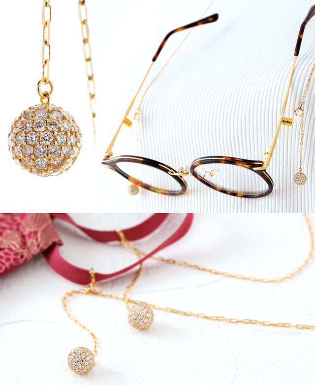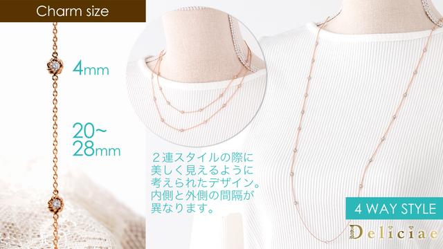 4WAYタイプのスタイルで、ネックレス~2連ネックレスに、 メガネチェーン~ マスクホルダーへと様々なシーンに合わせてお楽しみいただけます。ダイヤモンドを留めている枠は、裏返しになってもダイヤモンドの裏側がそのまま見えるようにオープンタイプになっています。