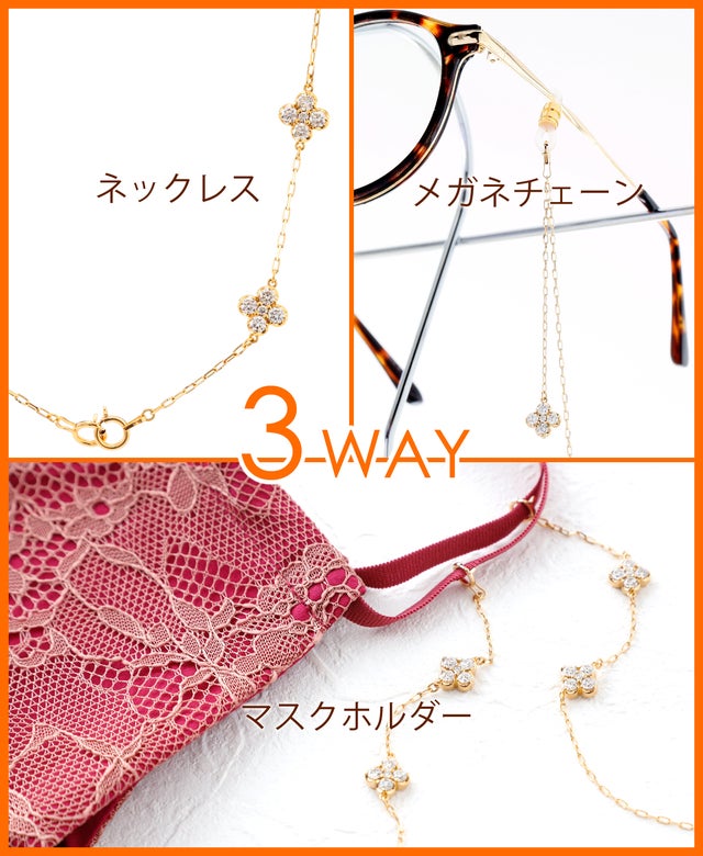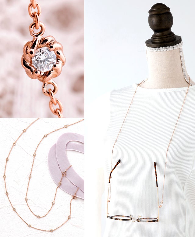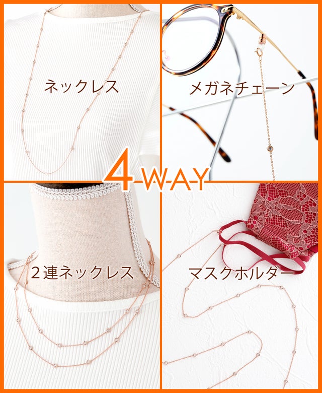 4WAYパターンが楽しめる、ネックレス~2連ネックレス、 メガネチェーン~ マスクホルダーにきせかえてお使いください。ダイヤモンドを留めている枠は、裏返しになってもダイヤモンドの裏側がそのまま見えるようにオープンタイプになっています。