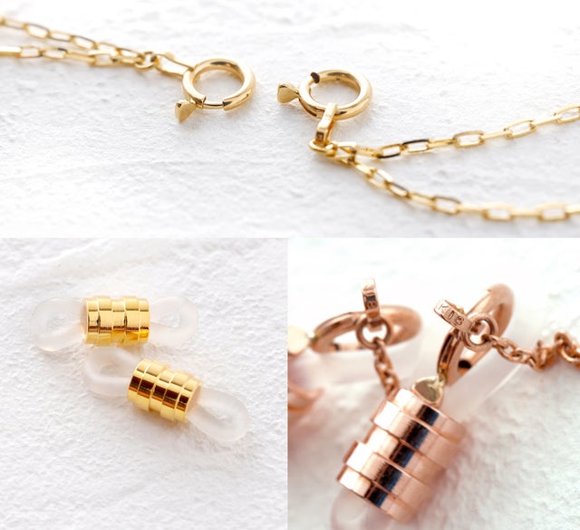 引き輪は取り扱いが簡単な大きめサイズになります。メガネ留めパーツにはフレームに傷がつかないシリコン素材を使用しました。