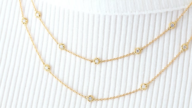 永遠につらなる幸福のように、小さな幸せをつなぎ合わせて表現されたステーションタイプのロングネックレス。そのシンプルなデザインとは裏腹に、25粒ものダイヤモンドをちりばめた繊細な輝きは、ラグジュアリーなひとときを演出します。