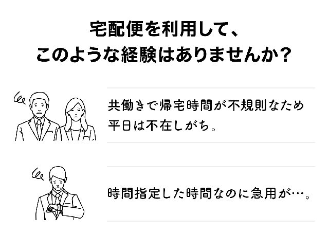 不在時や、在宅中に対応できない場合でも、コンパクトに玄関ドアにぶら下げておけば、配送員は荷物を入れて鍵をするだけで配達完了。配送員も受取人も再配達による全ての無駄が解消されます。