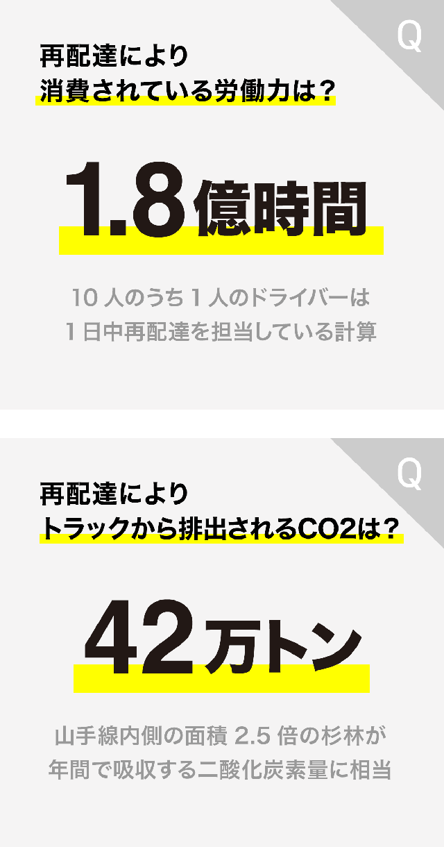 再配達に伴う労働力は年間で約 9万人分と推計されており、配送員さんの労働環境に多大な負担を与え、さらに再配達のトラックから排出されるCO2は年間約42万トンと言われています。これは山手線内側の面積2.5倍の杉林が年間で吸収する二酸化炭素量に相当します。