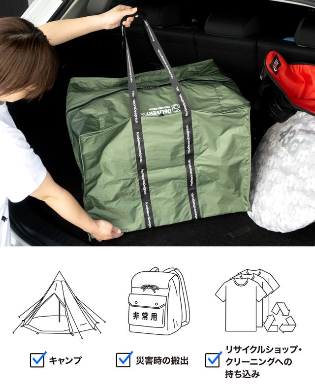 また、長年培った機能性生地の知識を活かし、雨水の侵入を防ぐレインウェアの生地で置き配用のバックを制作する事で、天候不順による急な豪雨や、梅雨時期の長引く雨から大切な荷物を濡らす事なく受け取る事ができます。
