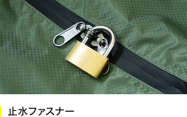 バックのセンターにはW Zip仕様の止水ファスナーを配置。ファスナーの隙間から雨水やホコリの侵入を防ぎます。また、ファスナーのスライダ先端の穴が重なる仕様になっているので、付属の南京錠を通し施錠する事ができます。