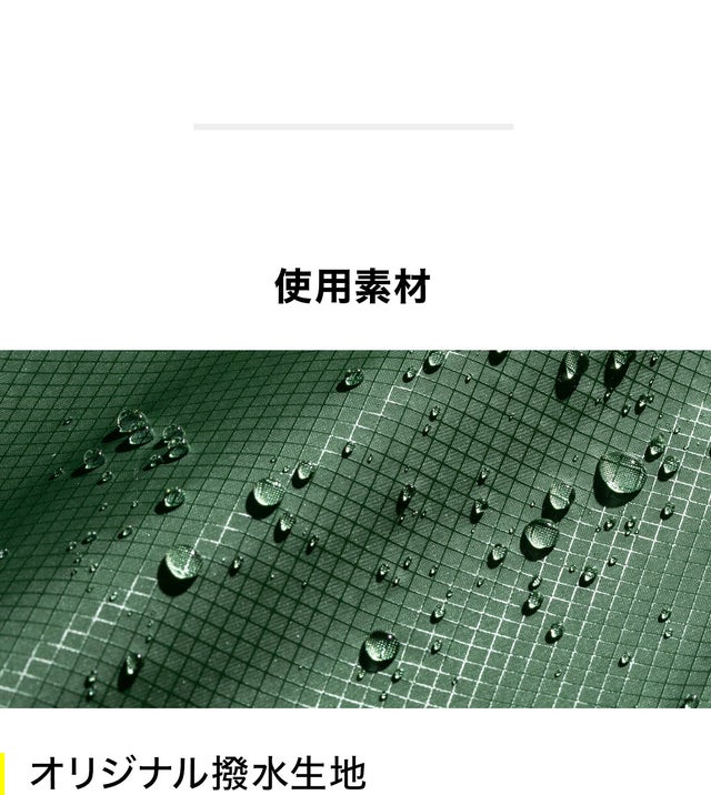 強度の高いリップストップナイロン素材を使用し、雨の侵入を防ぐ耐水圧は10,000mm/H2O、撥水等級は3〜4級と高く雨水を弾きます。