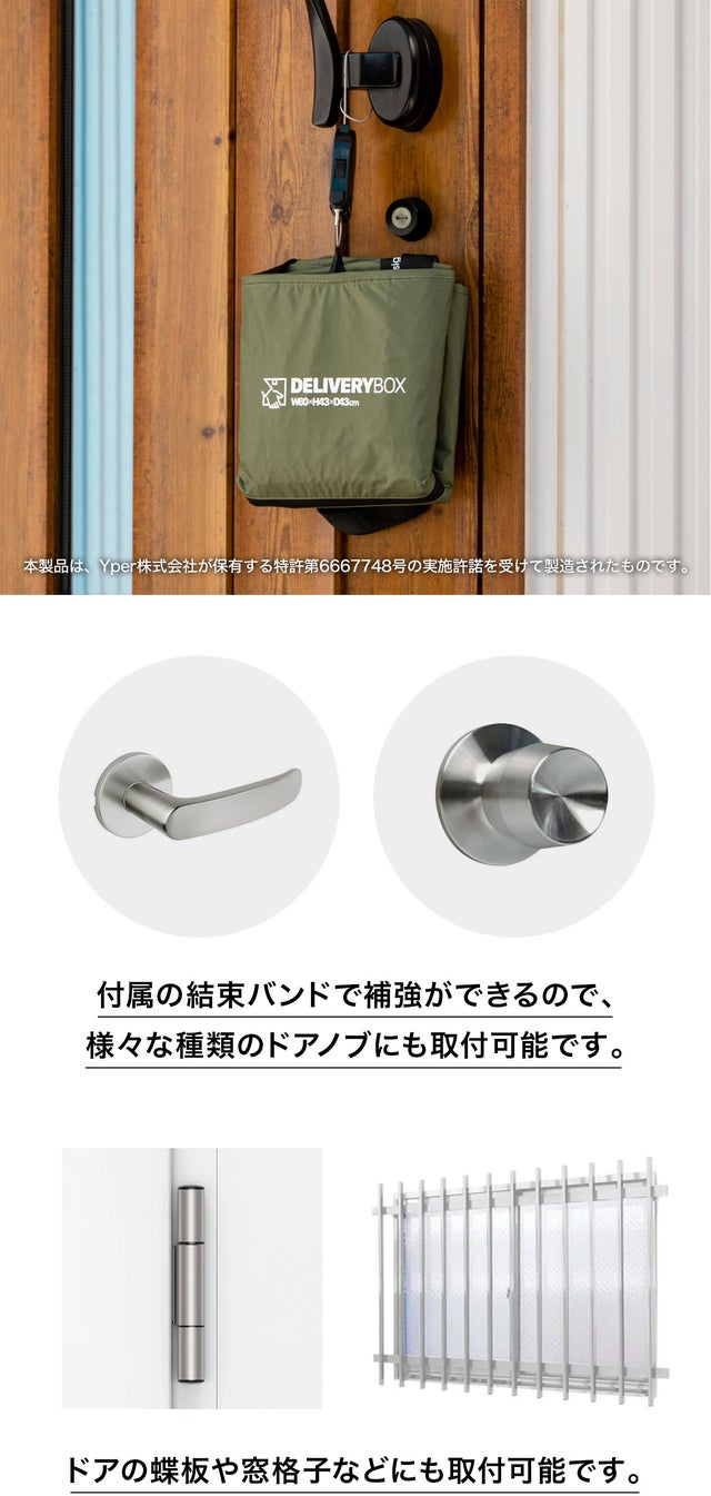 大きい宅配ボックスをおけない集合住宅であっても、付属のワイヤーロックで吊り下げるだけなので、受け取りまでは省スペース。ドア付近に吊り下げるだけだから設置も簡単。ドア以外にも設置が可能です。