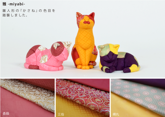 また、雛人形に使われる生地を使った『雅 -miyabi-』と、肌触りの良い生地を使った『三毛 -mike-』の二種のバリエーションがあります。