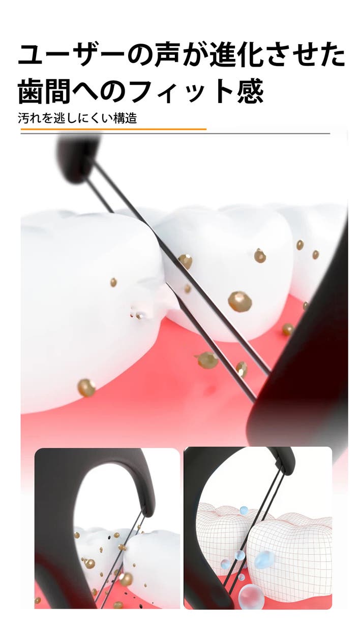 - 市販のほぼ全てのフロス糸に対応!歯並びや歯茎に最適な効率的な歯間ケアを実現します。