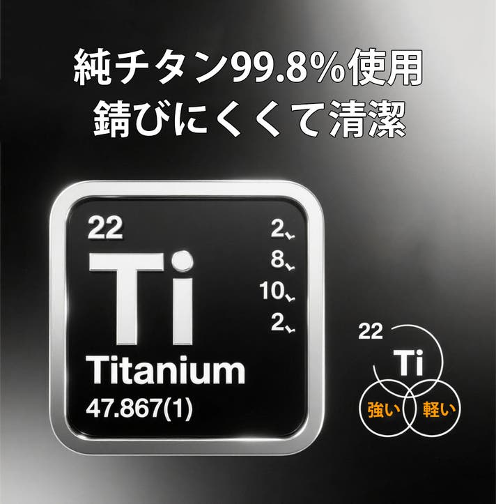 高純度チタン合金を採用し、毎日使うオーラルケア用品としての耐久性と清潔性を重視しました。錆びにくく、におい移りもしにくい素材特性により、水洗いやお手入れも気兼ねなく行えます。