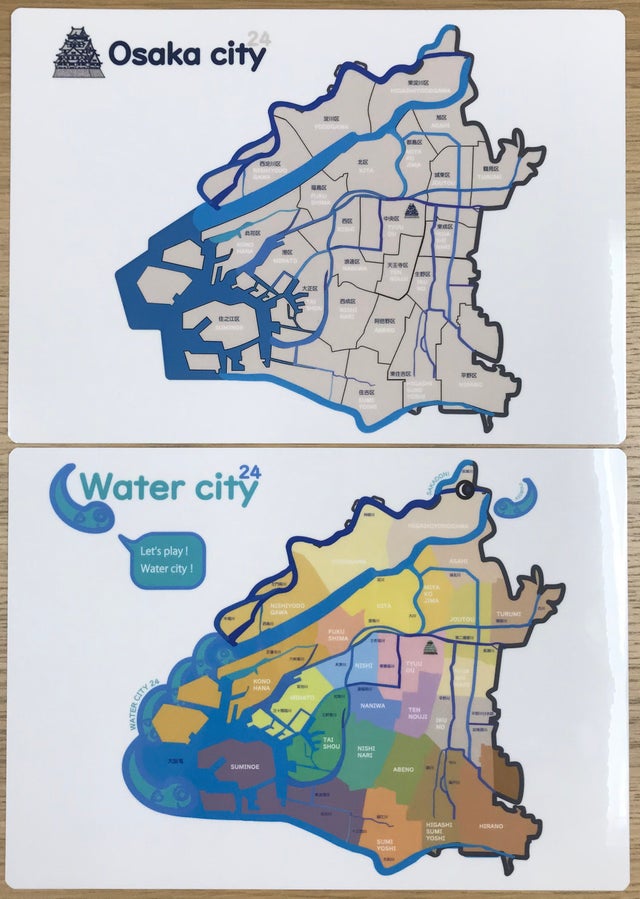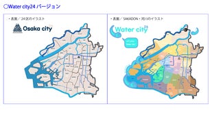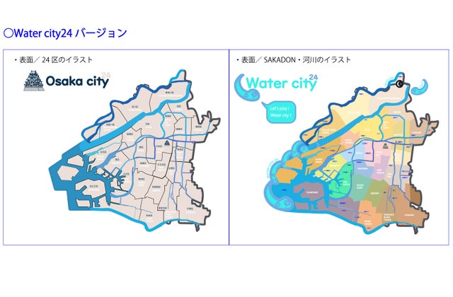 1.Water city24バージョン ・・・表面は"Osaka city24" /大阪市の24区の地図をデザインしています。裏面は"Water city24" /SAKADONとASOBOUの組み合わせと、河川の名称を表記して水都・大阪市をデザインしています。