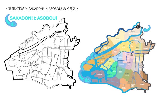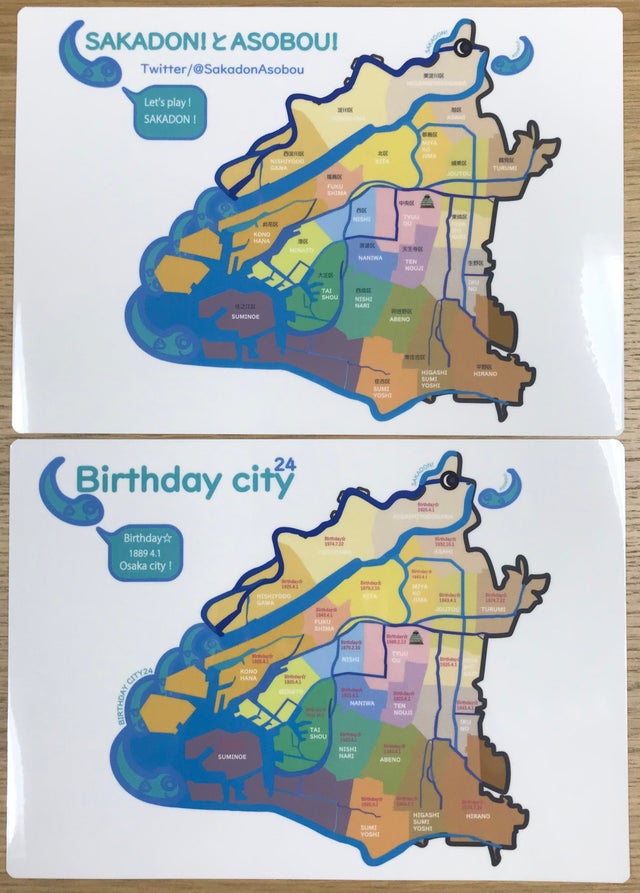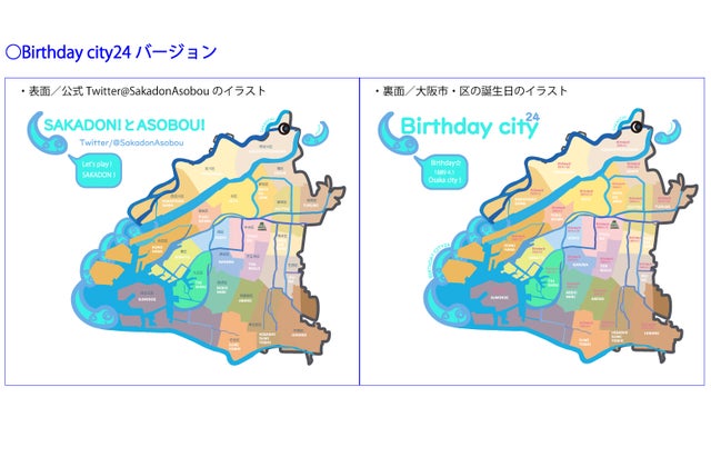 2.SAKADON!とASOBOU!バージョン・・・表面は"SAKADON!とASOBOU!" /プロジェクトの公式Twitter/@SakadonAsobouを表記したSAKADONとASOBOUの24区地図をデザインしています。裏面は"Birthday city24" /大阪市と24区の誕生した日を表記してデザインしています。