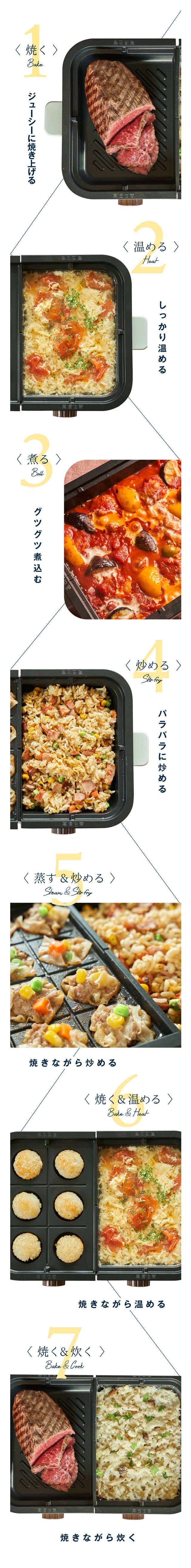 本製品は、これまでになかった「プレートを自在に組み換える」ことを実現させ、プレートで焼く、炒めるなどの単純作業から、「焼きながら炒める」といった時短で効率的な調理ができるよう開発致しました。