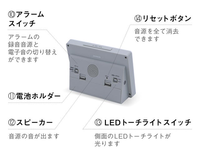 - 【目覚まし時計機能】内蔵の電子音に加え、録音した音源を目覚ましとして活用いただけます!