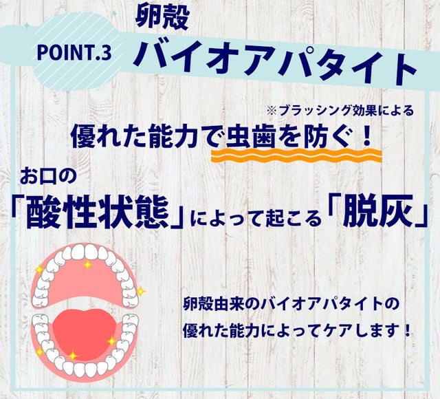 卵殻由来のバイオアパタイトの優れた能力で虫歯を防ぎ、歯のケアをしてくれます。