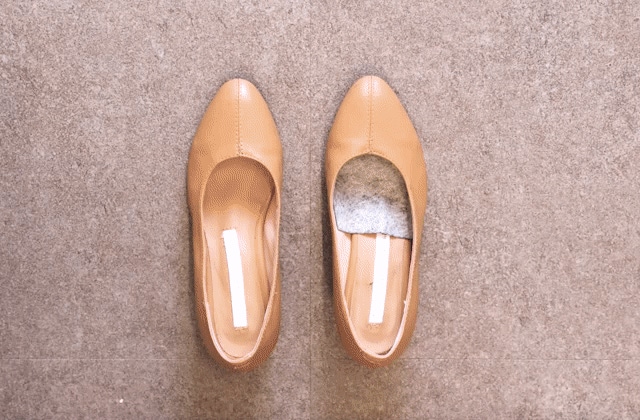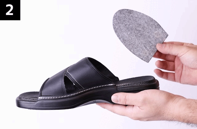 2 . 製品の貼り付け部分を靴の底側に向けて靴の内側に入れて付着してください。