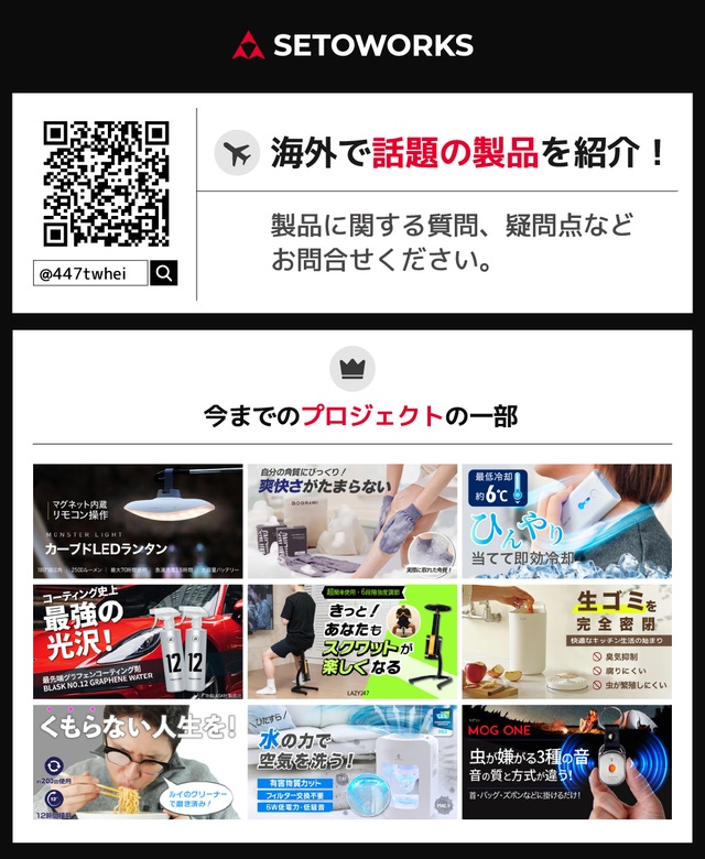 setoworksは日本の新しい製品を外国にいち早く紹介する事業を始め、海外の新しい商品や直接企画した多様なプロダクト製品を日本国内に紹介する事業を展開しています。たくさんの応援の程よろしくお願い致します。