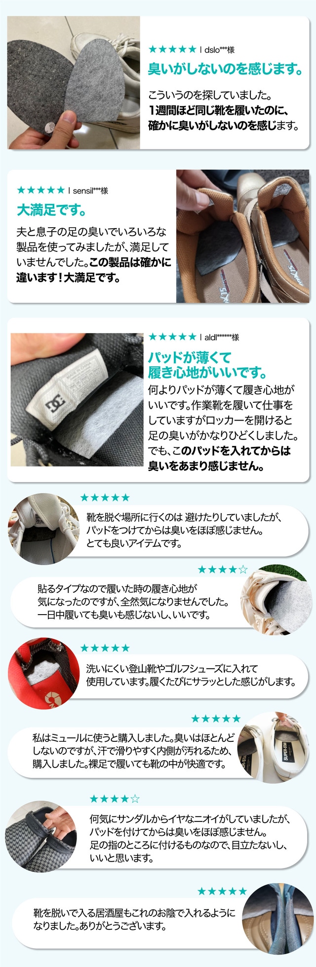 私は足のニオイのせいで悩んでいました。夏になると特に感じるので、靴を脱ぐ場所に行くのを避けていました。そんな時にこの製品を見つけ満足したので、多くの皆様にご紹介したいと思いました。