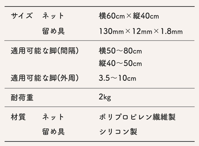 A. 机の脚の大きさや間隔によって、取り付けられるかどうかが決まります。詳細は、製品仕様に記載されている「適用可能な脚(間隔)」および「適用可能な(外周)」の寸法を参考にしてください。