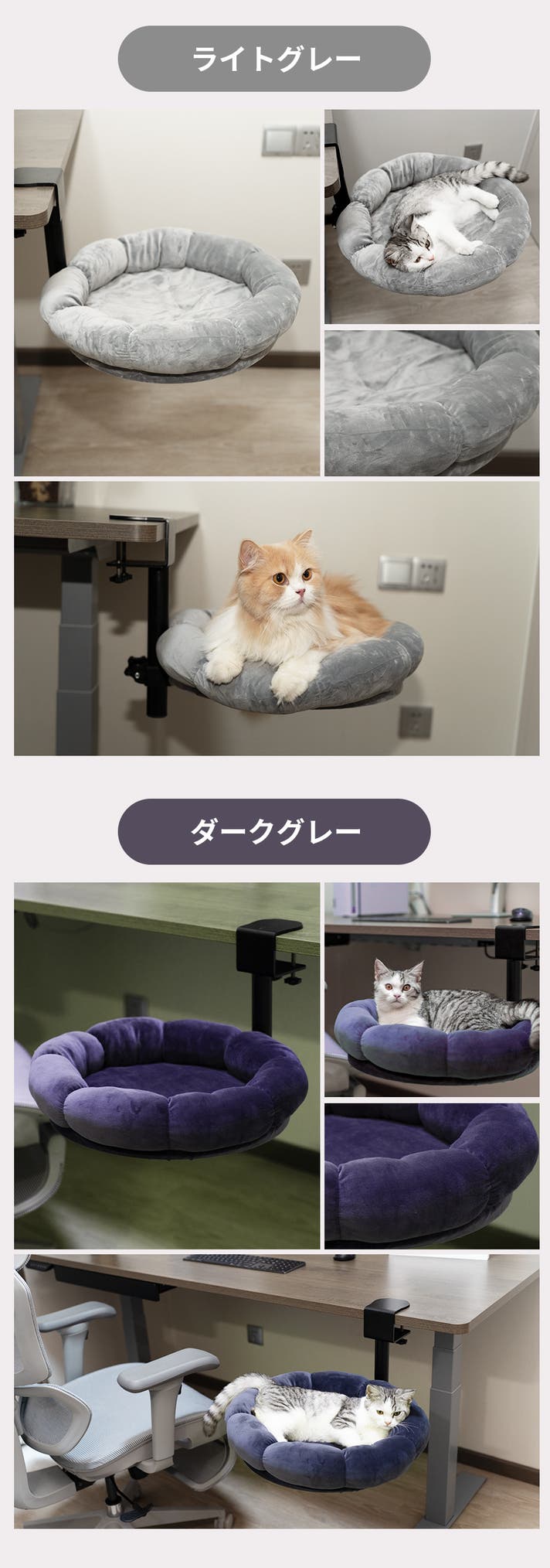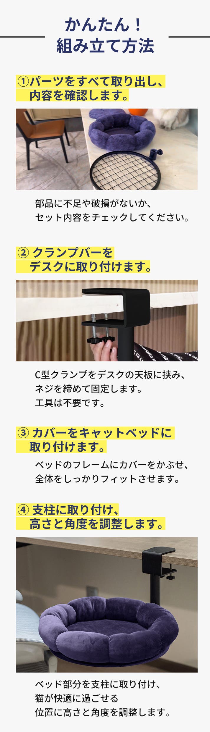 A. はい。支柱部分で高さを調整でき、デスクの高さや猫の体格に合わせて設置可能です。