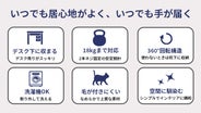 仕事の合間に、のんびりティータイム。ベッドカバーの周りのふかふかのクッションをふみふみ。カバーは洗濯機で洗えるから、いつでも清潔。毛やにおいを気にせず、ゆったりとした時間を過ごせます。
