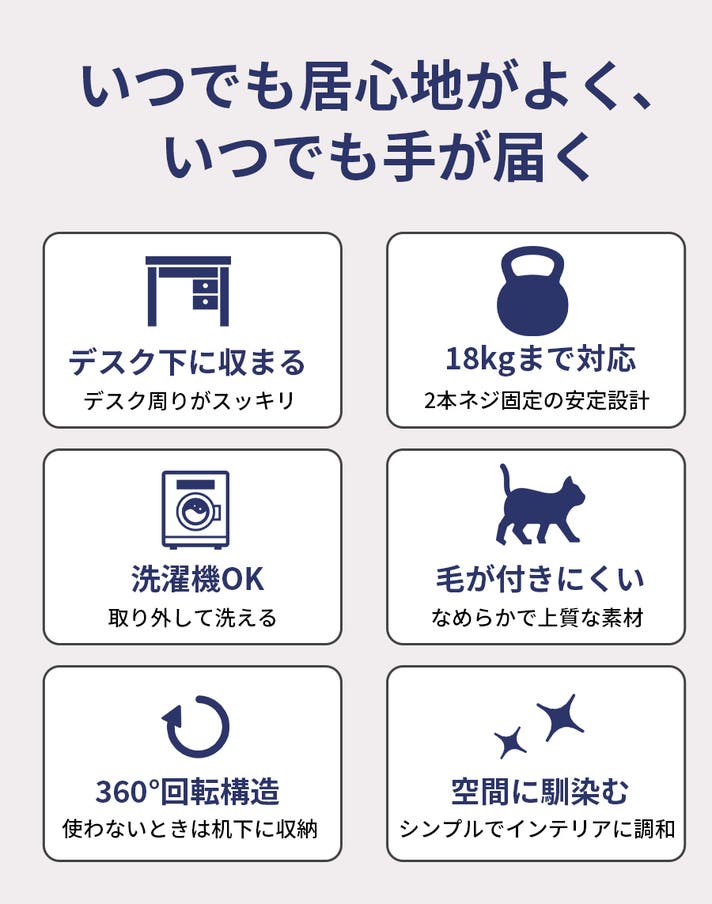 - 2本ネジ固定+耐荷重18kg。大型猫でもゆったりくつろげる安定設計。