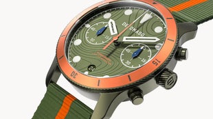 時計本体のメインカラーであるオリーブカラーとオレンジカラー。同じコントラストのストラップは水にも強いだけではなく、リサイクル海洋プラスティックを使用し地球に優しい素材を採択しています。バックルはボディと同じステンレスにIPオリーブグリーンを施しています。