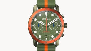 DETOMASO VENTURE TOPOオリーブのケースボディは文字盤と同様のオリーブカラーヨーロッパをはじめとして数年前から流行っていたグリーン系文字盤は完全に定着化しました。医療用316LステンレスにIPオリーブグリーンを施しています。秒針とベゼルはグリーンの反対色であるオレンジを採用しています。オレンジ系とグリーン系の組合せは派手なイメージが付き纏いますが、そこはドイツデザイン落ち着いたマットの色合いを採用しています。大人が使える時計です。