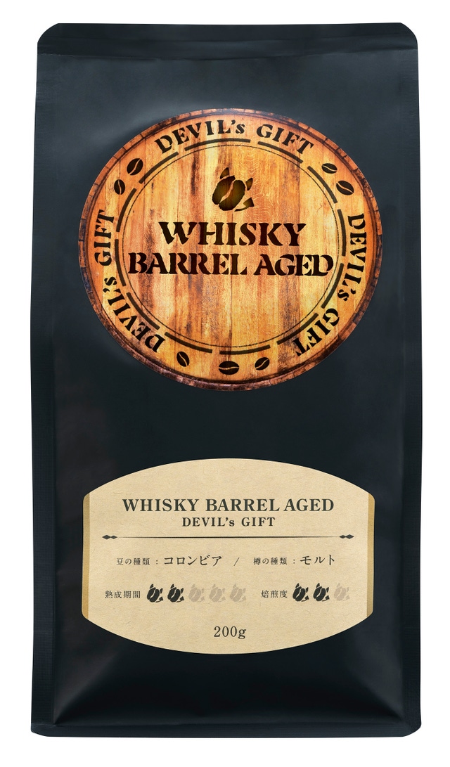 「悪魔の取り分」のおかげで、ウイスキーを取り出し終わった樽にも豊かな香りが残されています。この樽にコーヒー生豆を入れて、じっくり熟成させることで、コーヒー豆に香りが移り、さらに焙煎することで驚くほど豊かな香りが楽しめるコーヒーに仕上がります。いわば、「悪魔からのおすそ分け」を受けてつくったコーヒー豆ですね。なお、この商品の商品名「デビルズ・ギフト」は「悪魔からのおすそ分け」をイメージして付けました。